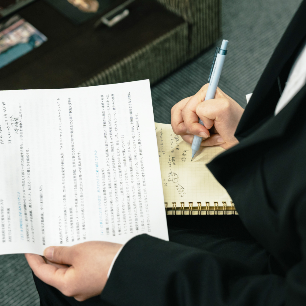 社長を取材する前に実践的なインタビュー練習をします。