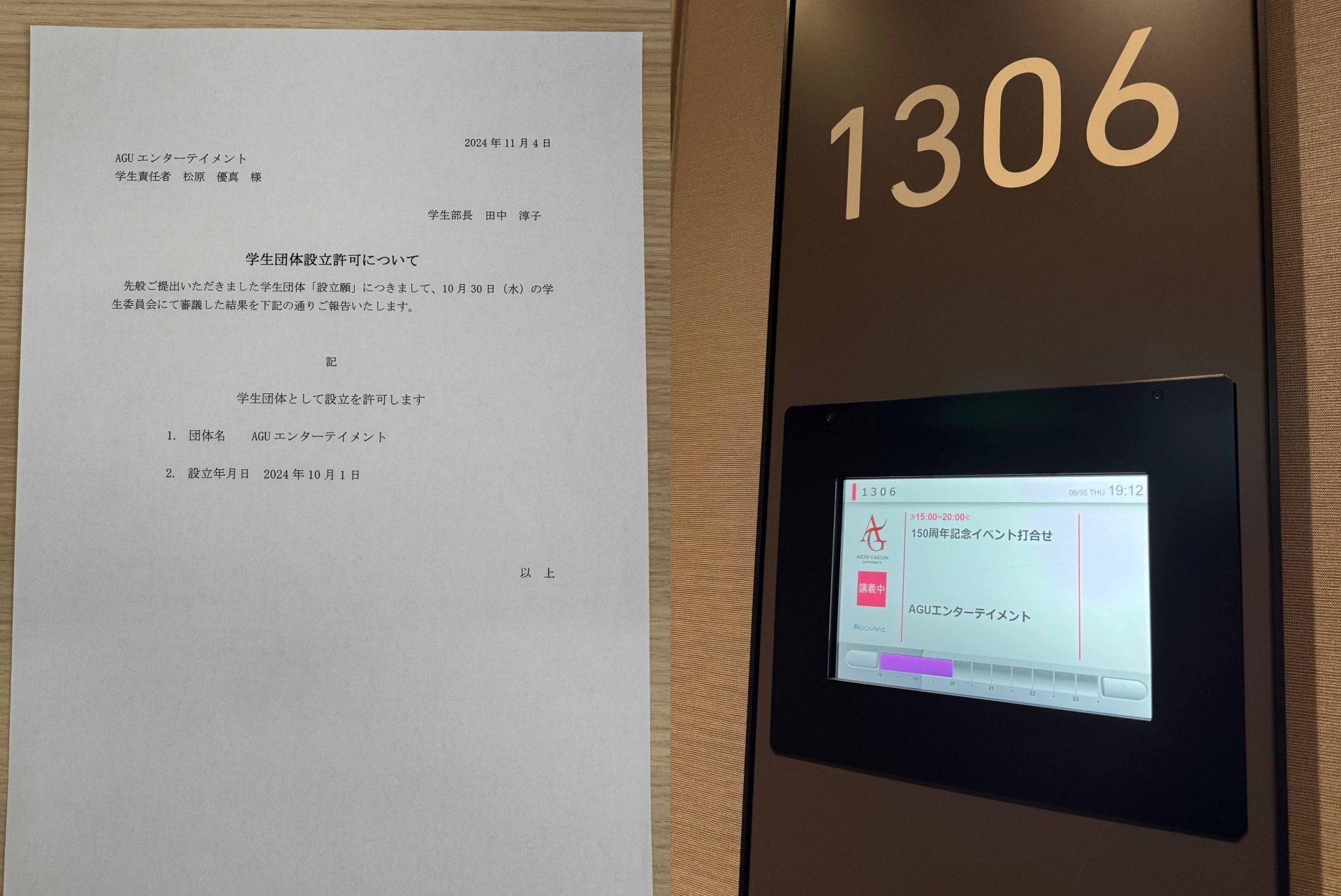 (写真右)活動するために教室を予約すると、電子掲示板に「AGUエンターテイメント」と表示されて感動したそう。同時に「いよいよここからが本当のスタートだ」と身が引き締まったという松原さん。